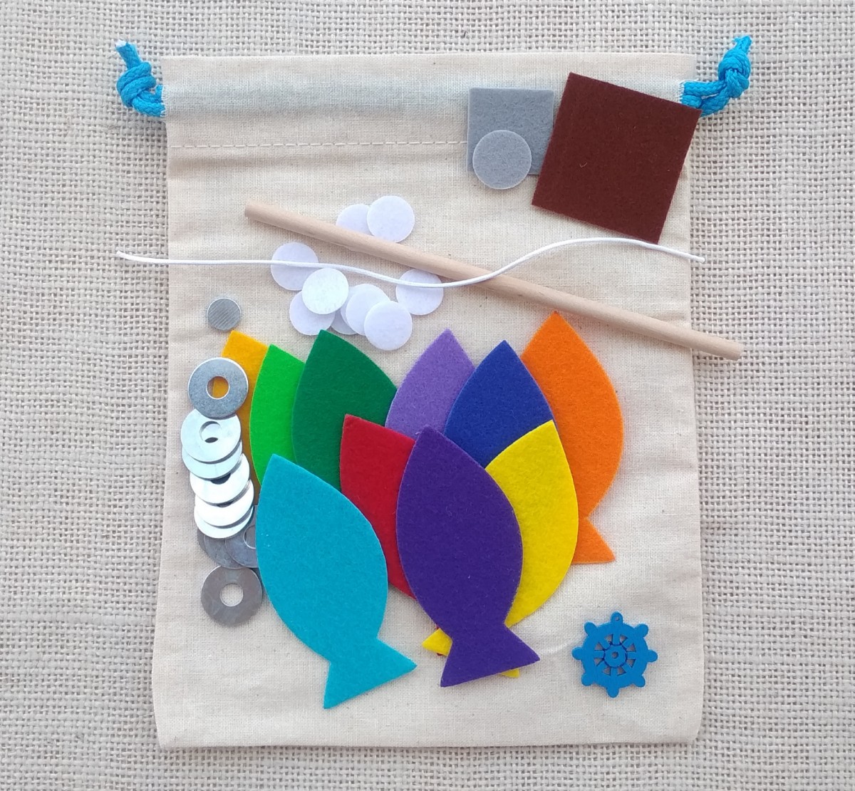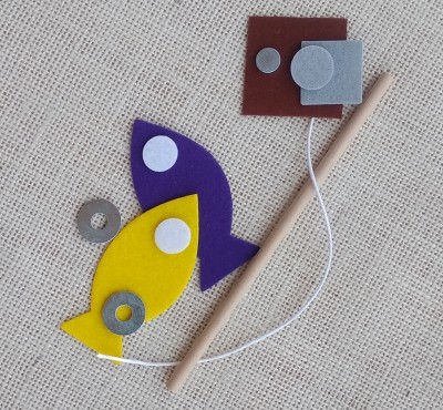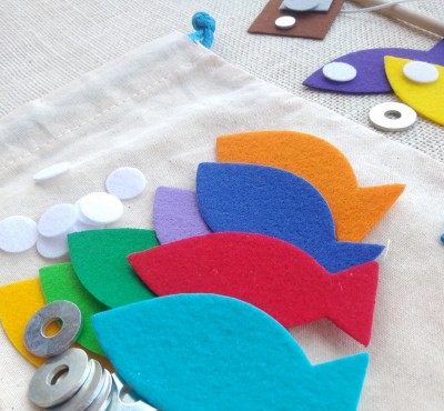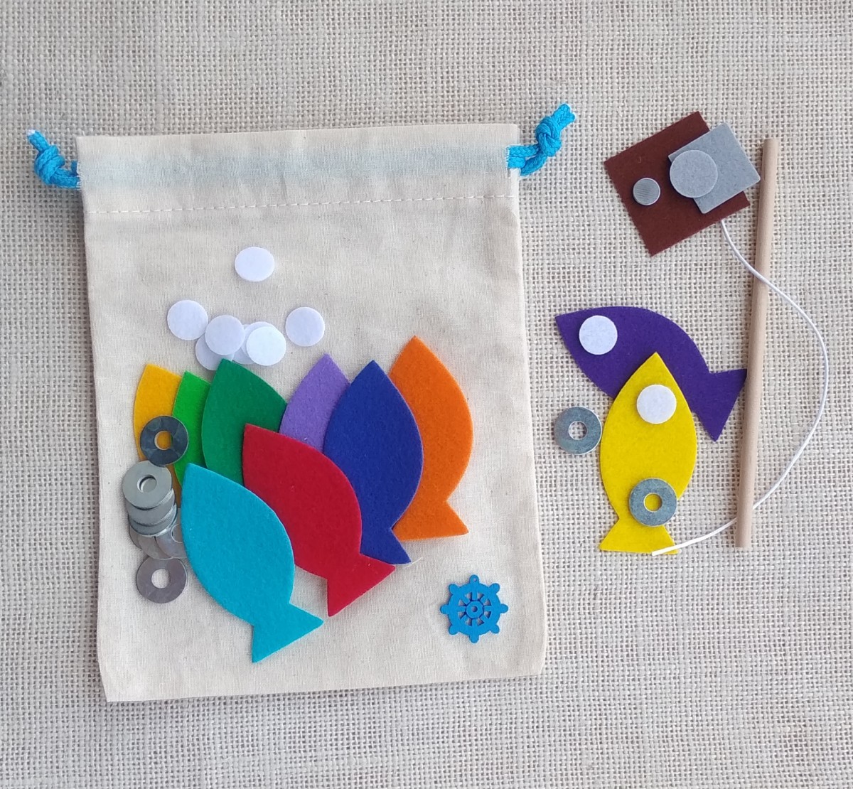Vamos a darte todo lo necesario para que puedas confeccionar el juego de pesca para llevar en el bolso.Puedes seguir el tutorial de la actividad de la pesca aquí como guía para confeccionar los peces y la caña.